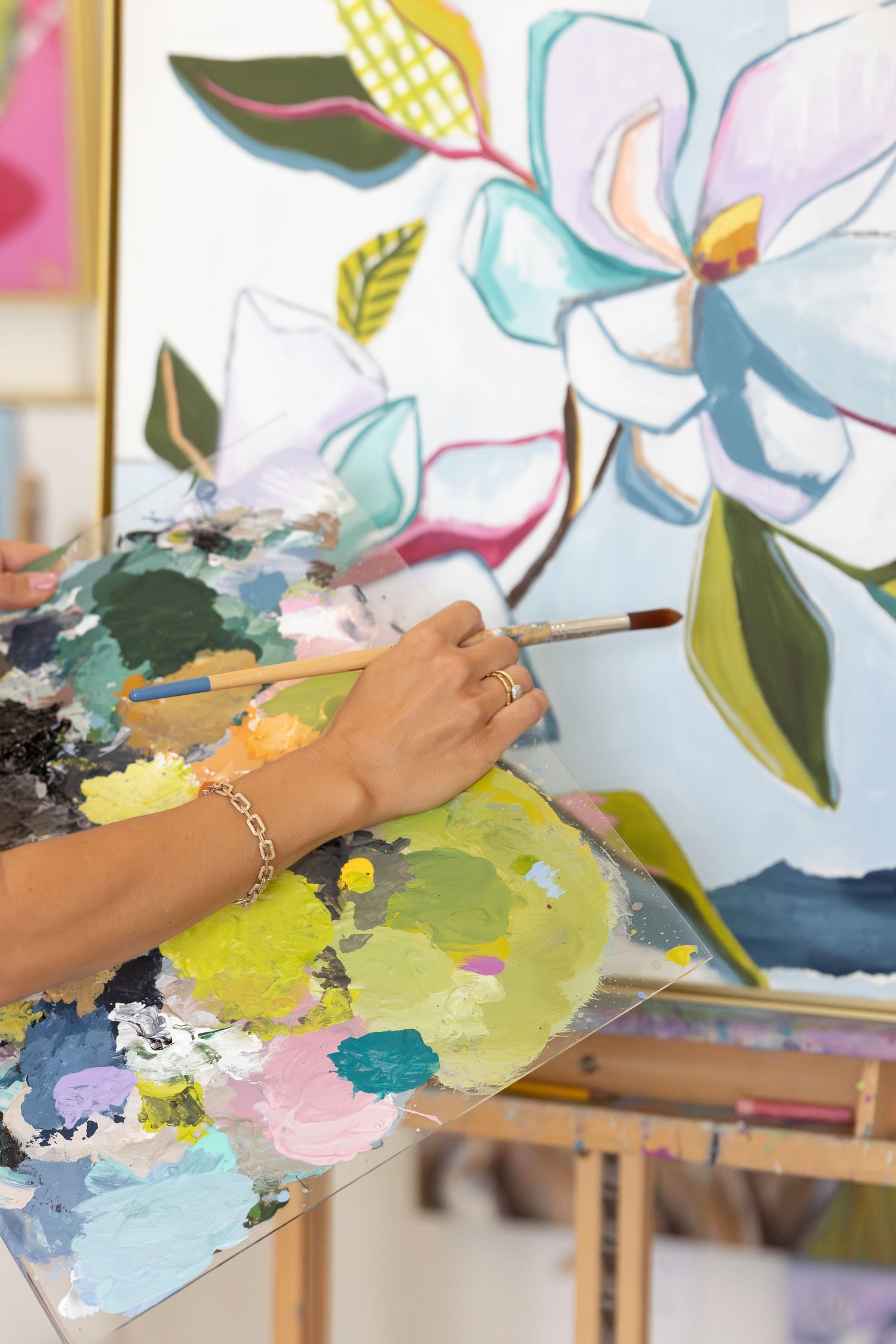 Throughout my art journey, I have always drawn from my Interior Design background to paint unique statement pieces that you can design a room around. My goal is to create artwork that will transform a space from ordinary to extraordinary! My passion is to create joy through creativity, and it is my hope that my artwork will spread joy and happiness through each piece collected…as a love letter of sorts…from my easel to your home.