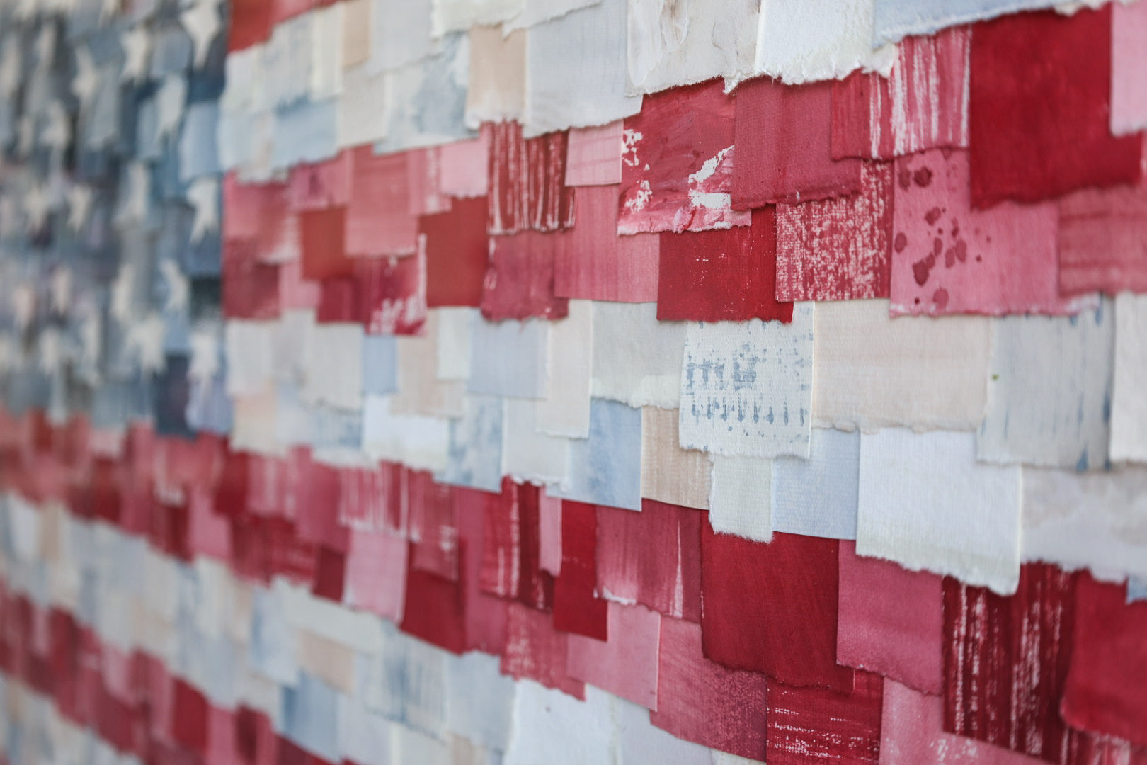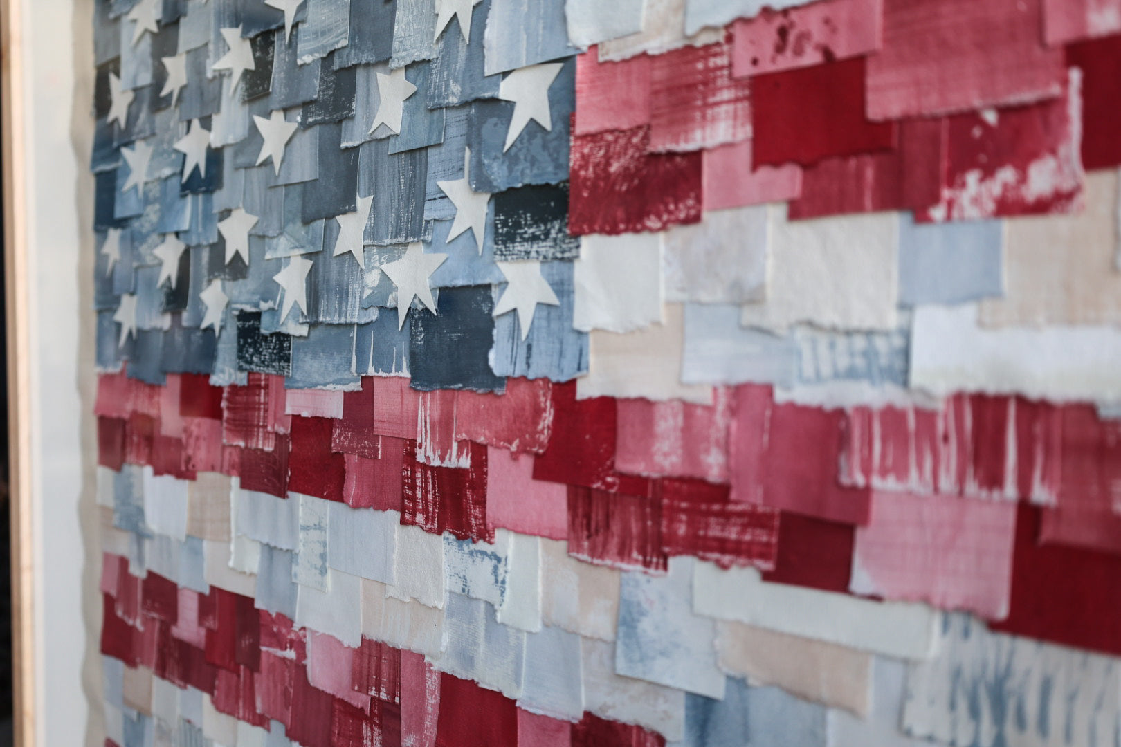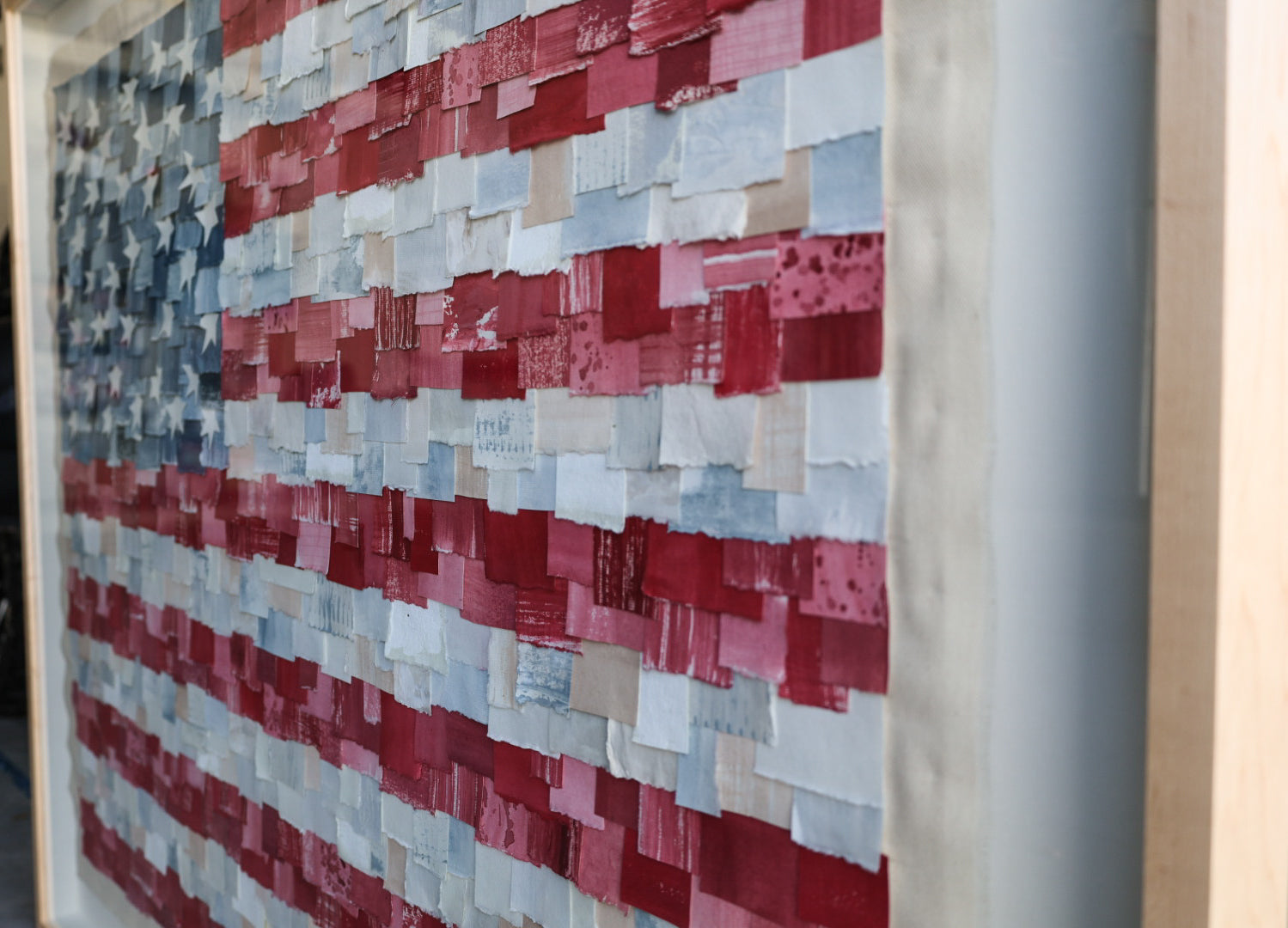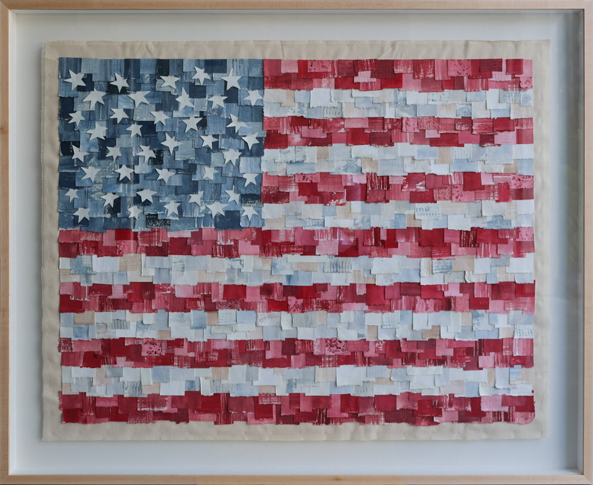 40x49.5 Mixed media American Flag. Framed in a light wood shadow box frame.