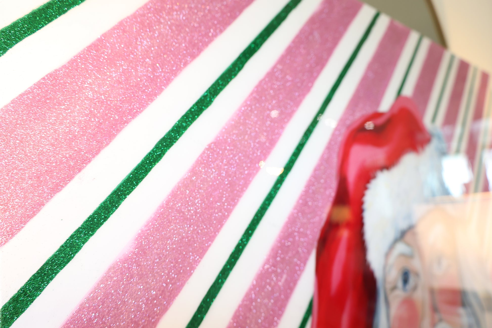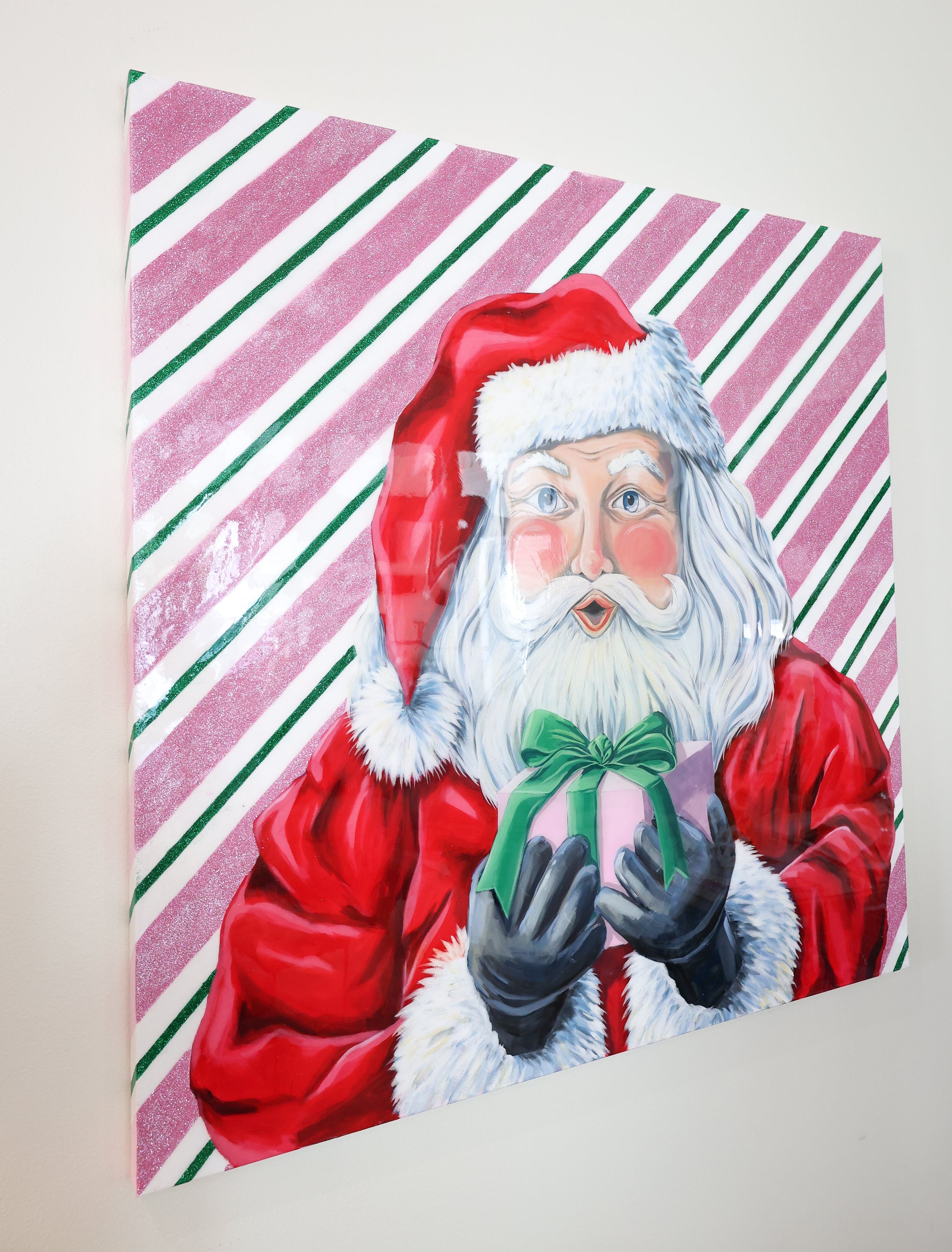 48x48 Santa. Acrylic on canvas with glitter stripes and resin finish.